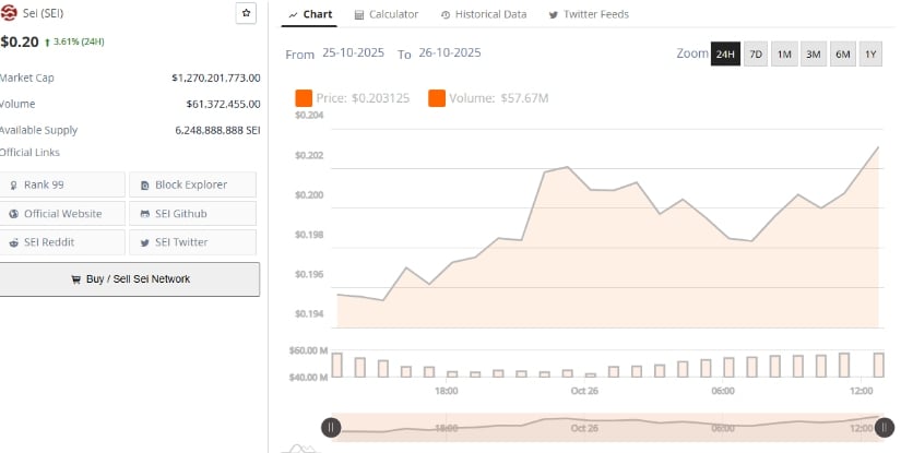 BraveNewCoin утверждает, что SEI торгуется по цене $0.20, что на 3.61% выше за 24 часа. Рыночная капитализация? $1.27 миллиарда. Рейтинг? 99-й. Ежедневный объем? $61.37 миллиона. Предложение? 6.24 миллиарда токенов. 🤯 Перевод: Жидкости достаточно, чтобы в ней поплавать, но не настолько, чтобы разбудить акул.