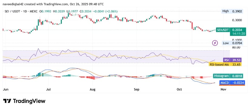 Дневной график TradingView показывает, что SEI держится на уровне $0.203, увеличившись на 1.86%. После октябрьского пожара 🗑️, он удерживается выше $0.19-$0.20, как турист, избегающий сомнительных переулков. Маленькие свечи? Трейдеры столь же нерешительны, как кот, выбирающий место для сна. 🐱
